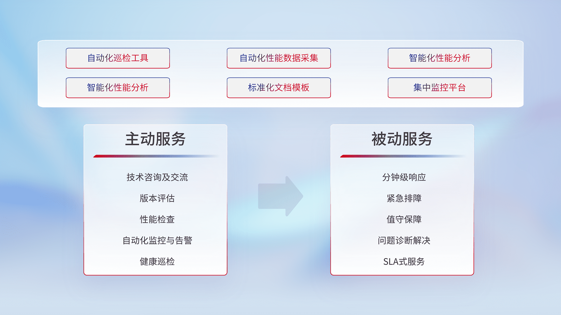 智能化工具和标准化文档,,,保障服务质量,,,,提供主动服务(包含技术咨询、、、、版本评估、、、性能检查、、自动化监控与告警、、、健康巡检)和被动服务包含(分钟级响应、、、、紧急排障、、、、值守保障、、、问题诊断解决、、、SLA服务)。。。。